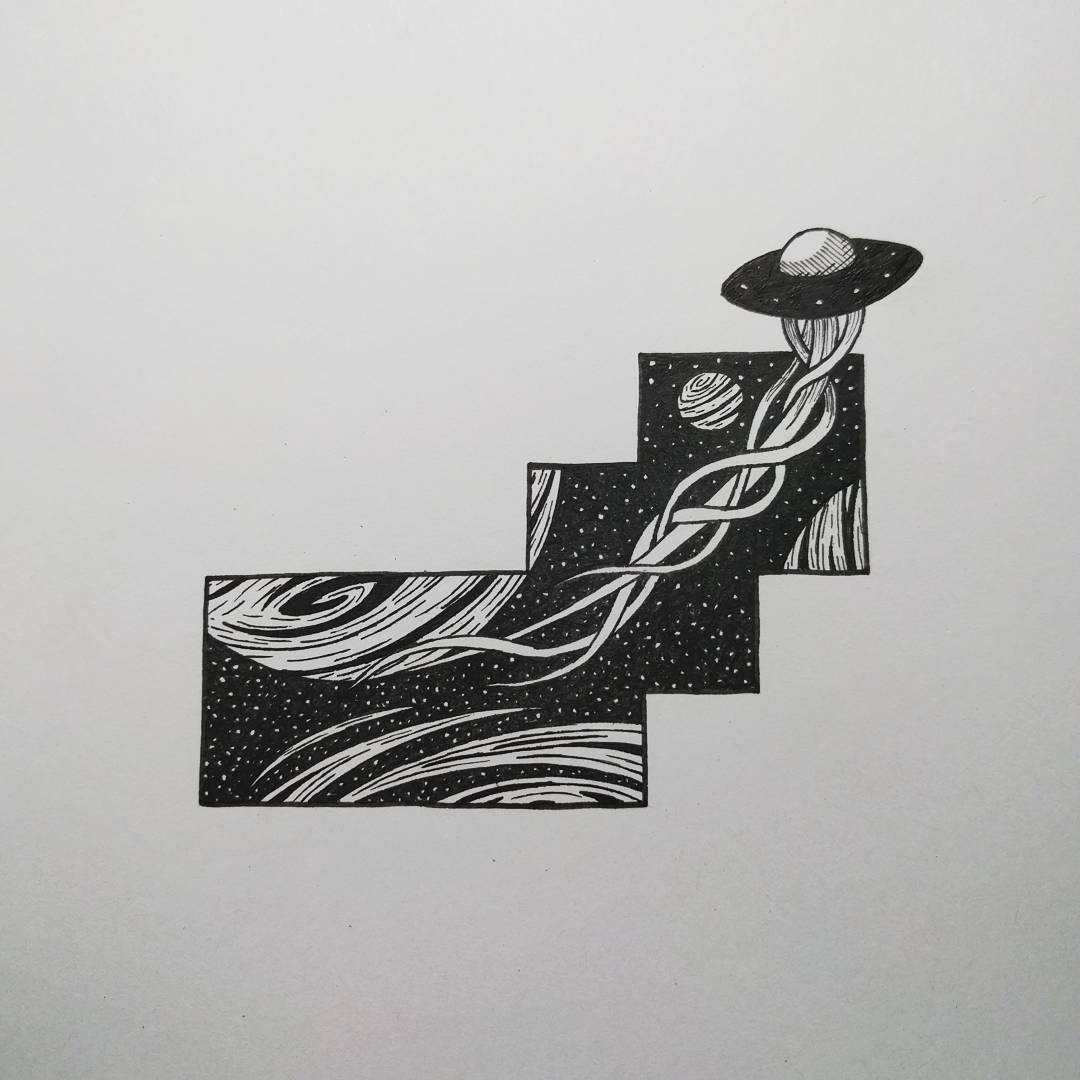 With a strong interest in space, I wanted to explore some scenic areas in outer space. The first drawing depicts the solar system as scene through a telescope.I decided to cram in as much of our solar system as I could into the image and have fun with it. This was done with a pencil sketch and then gone over with fine tipped pens to try and keep details.
